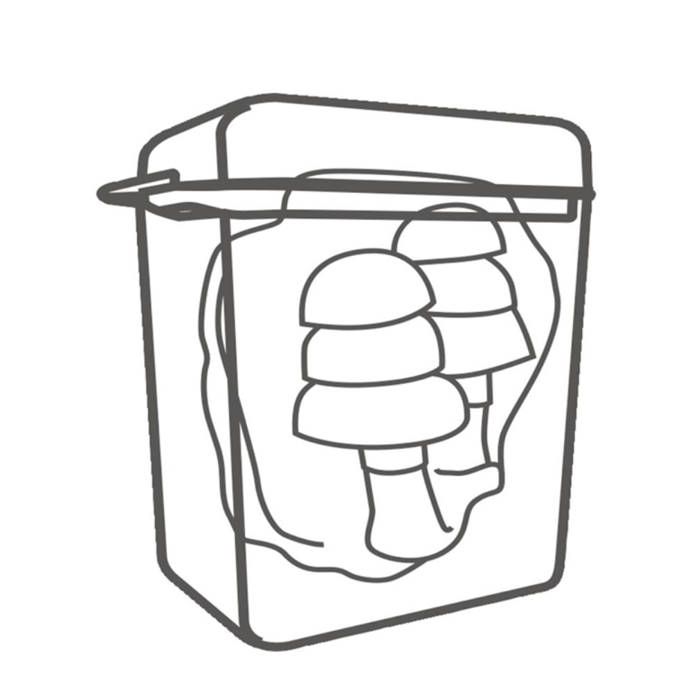 Bag of 10 pairs of reusable thermoplastic (TPR) earplugs with textile cord. Can be used with or without cord (9 pairs in bag + 1 pair in storage box).