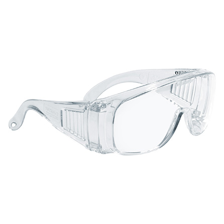 Safety visitor polycarbonate spectacles with large ventilated sidearms with attachement points for neck cords, with lens thickness of 2.00 mm and no metallic parts.
