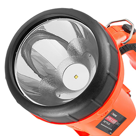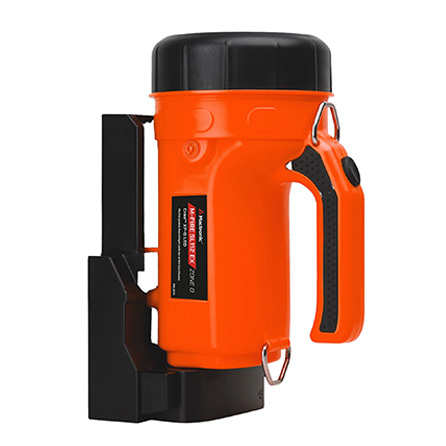 The M-FIRE SL112 EX Zone 0 spotlight is a new addition to the flagship series of the intrinsically safe heavy duty lighting. The spotlight generates light at 222 lm, with the beam reaching up to 432 m. The spotlight is powered by a high capacity battery allowing it to operate up to 4 hours 15 minutes in max power mode, and a staggering 82 hours in eco mode. This amazingly long operating time is the product’s key feature. The extremely long operating time is crucially important in emergency situations, such as survival in adverse environmental conditions. The M-FIRE SL112 EX Zone 0 is IP64 and EX-ATEX certified, not only fully resistant to dirt and water, but also safe to operate in explosion zones. It comes with a flame retardant shoulder strap with a quick-release buckle. The spotlight is recharged through a base that can be vertically mounted, e.g. to a wall.