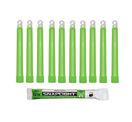 6” green SnapLight lightsticks (15cm), duration of 12 hours. Each green 6-inch SnapLight light stick is individually foil-wrapped for protection from light and moisture, and has up to a five-year shelf life from date of manufacture.