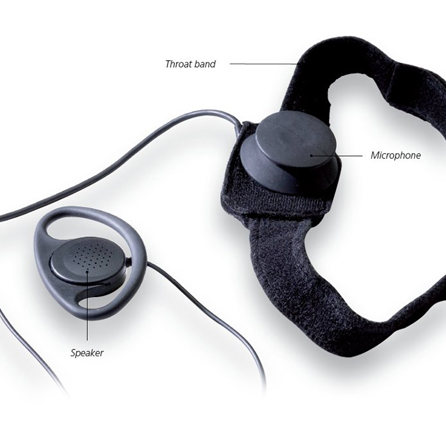 A comfortable throat microphone for communication in high-noise environments or other extreme conditions. Enables even whispered communication.